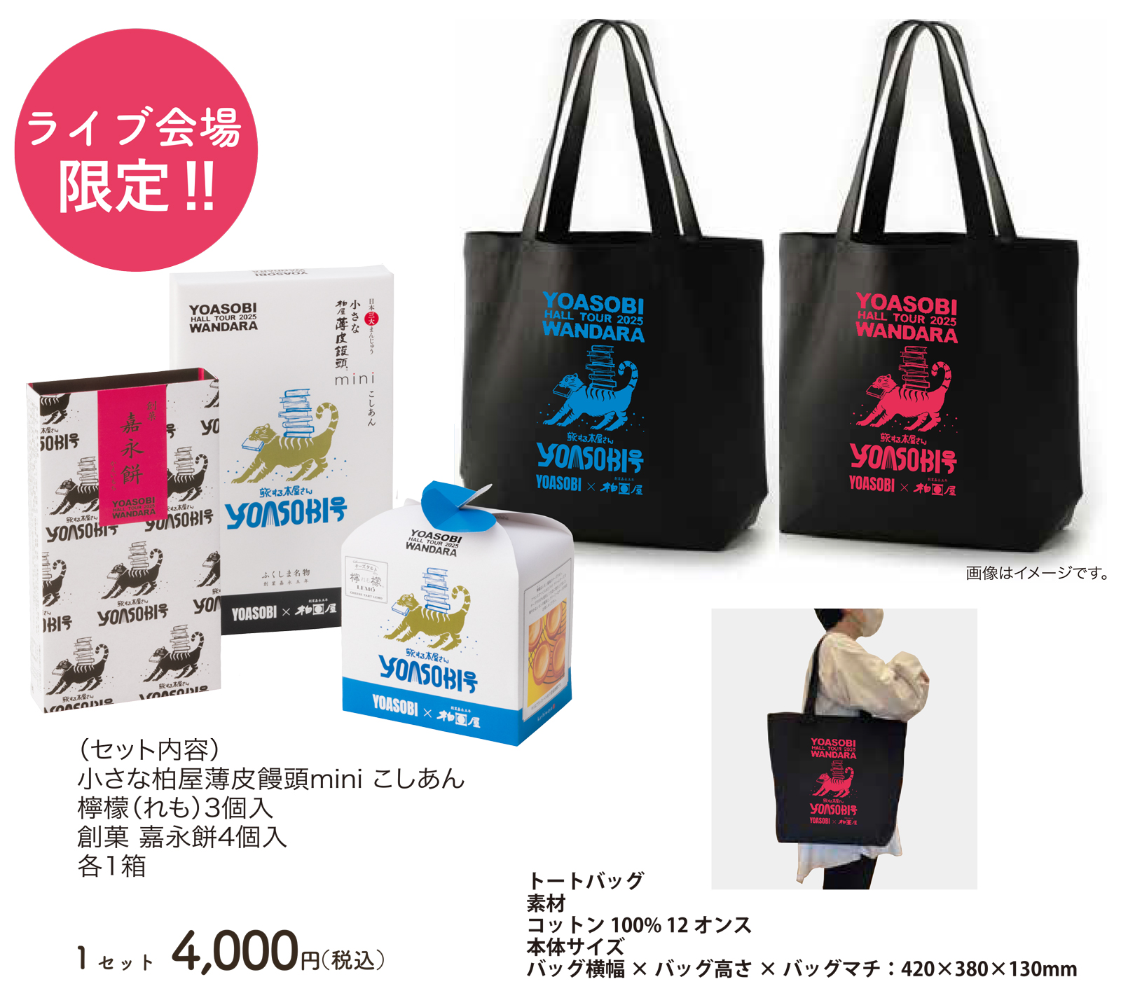 株式会社柏屋は、アーティスト・YOASOBIの国内ホールツアー「YOASOBI HALL TOUR 2025 WANDARA」福島公演の開催を記念して、「YOASOBI コラボパッケージ」の商品を発売いたします。ライブ当日の会場販売の他、期間限定で柏屋直営店舗、駅、サービスエリア売店、通信販売、柏屋オンラインショップでも購入可能です。