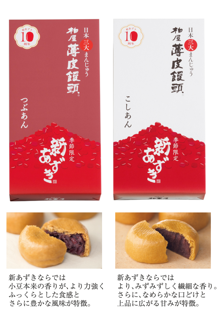 - 採れたての新物あずきを自社で丁寧に炊上げた餡に、ふわふわふんわりの蒸し生地ではさみました。新あずきの餡は瑞々しくふわふわしっとり。生地とも相性が抜群です。