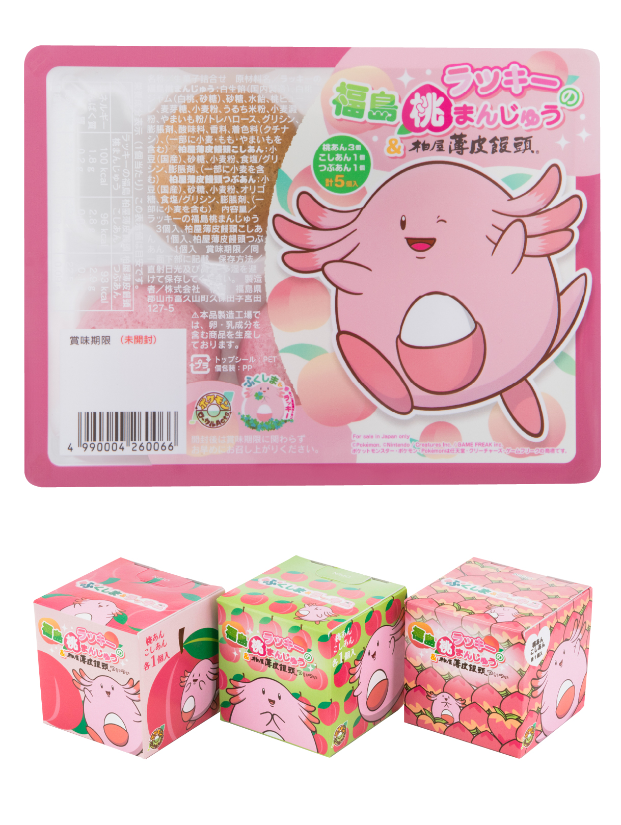 ふくしま応援ポケモン「ラッキー」をイメージした桃色のおまんじゅう。