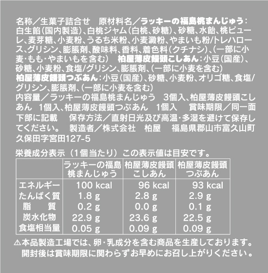 | エネルギー | 桃まんじゅう:100kcal こしあん:96kcal つぶあん:93kcal ※各1個あたり |