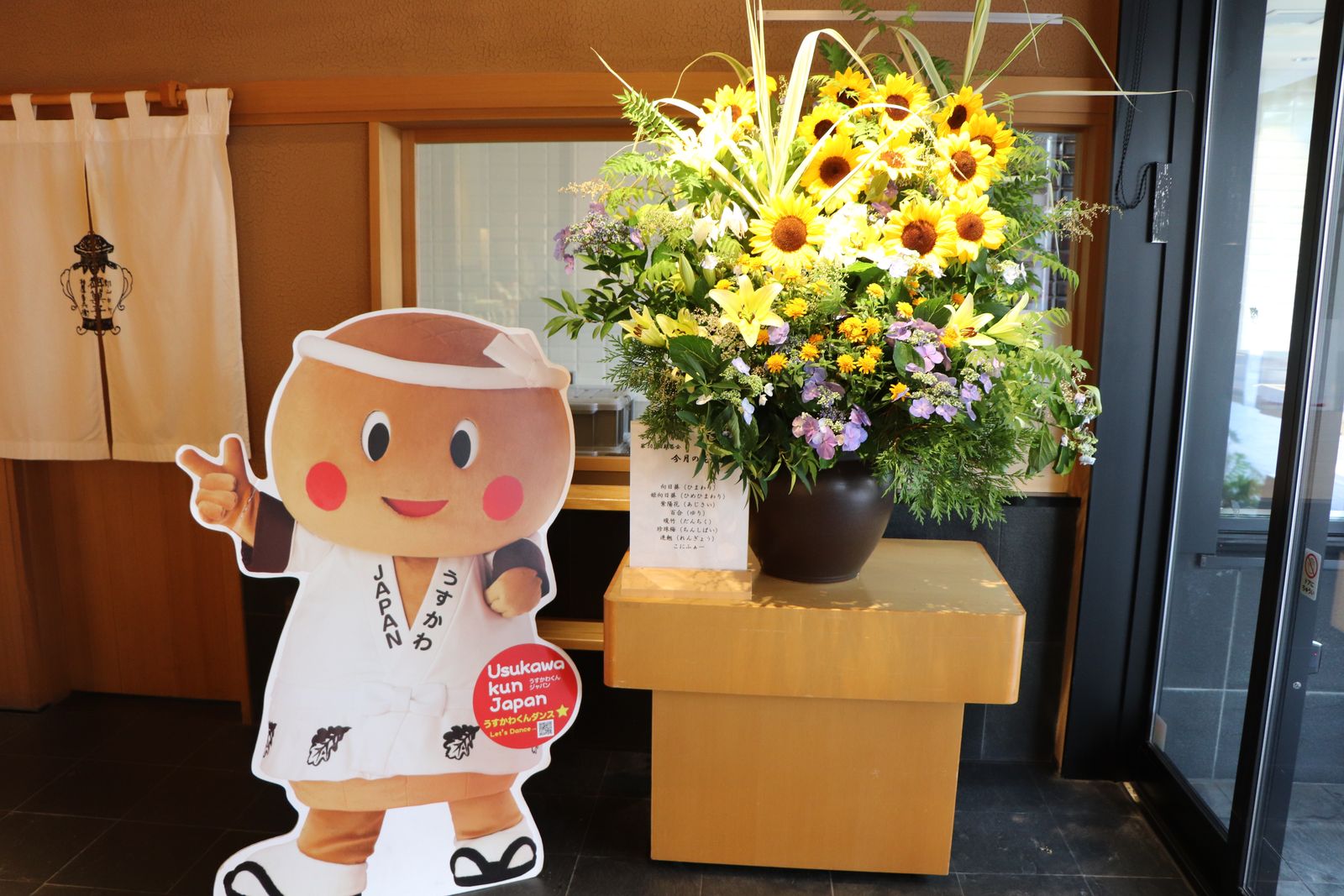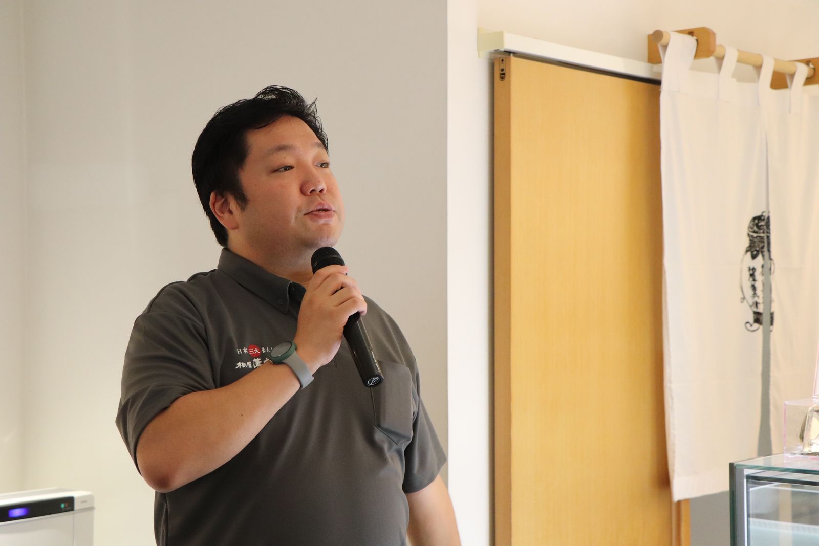 うすかわくん会場に入る前に、柏屋の本名社長が朝茶会の楽しみ方を詳しく説明してくれるよ♪