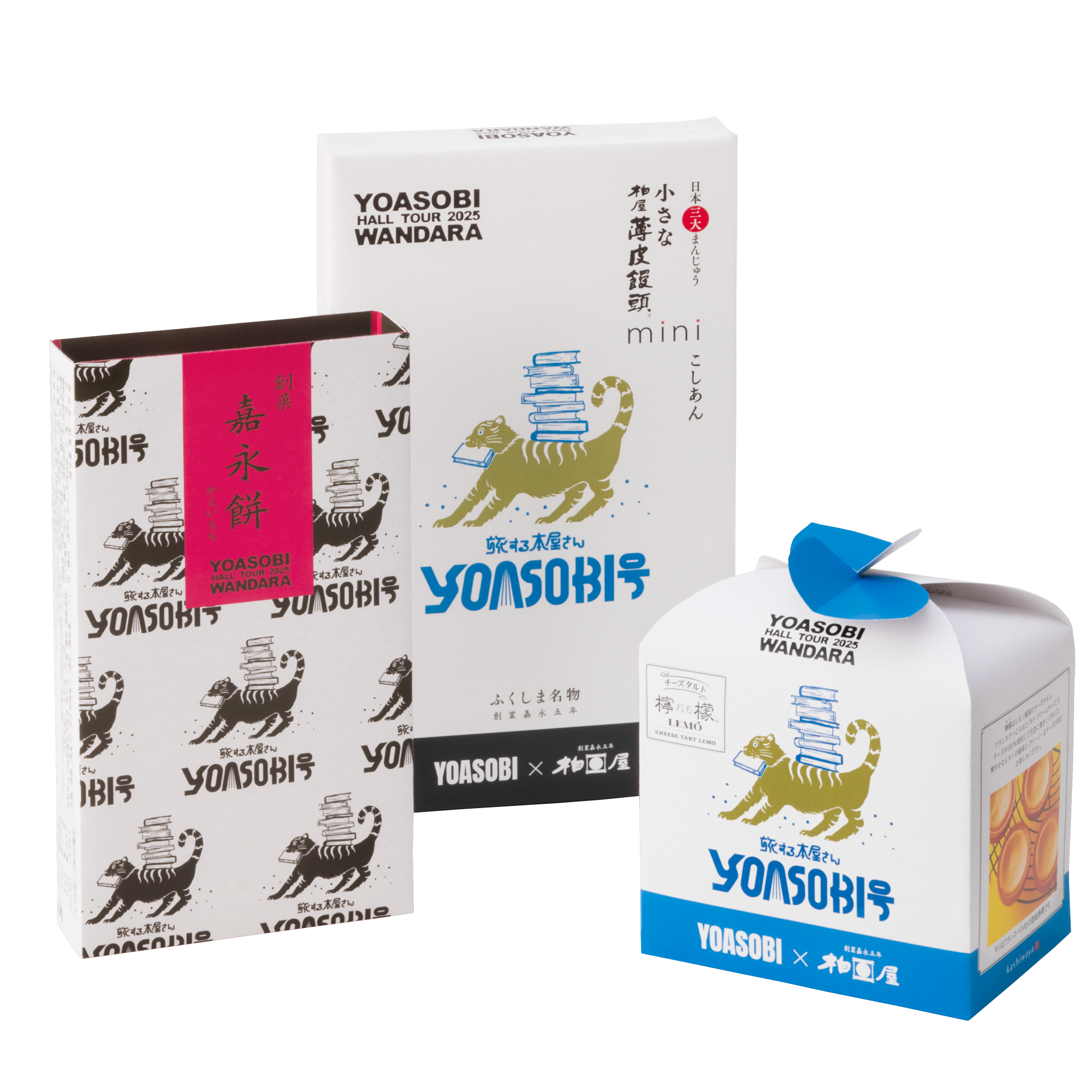 株式会社柏屋は、アーティスト・YOASOBIの国内ホールツアー「YOASOBI HALL TOUR 2025 WANDARA」福島公演の開催を記念して、「YOASOBI コラボパッケージ」の商品を発売いたします。ライブ当日の会場販売の他、期間限定で柏屋直営店舗、駅、サービスエリア売店、通信販売、柏屋オンラインショップでも購入可能です。
