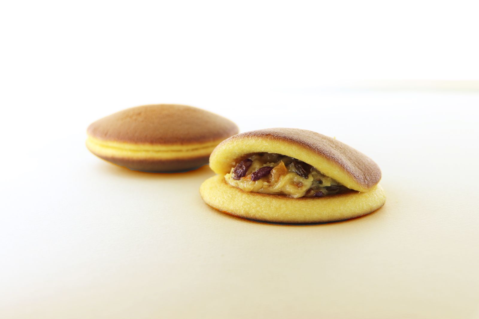 既製のカスタードクリーム(フラワーペースト)にフルーツの砂糖漬けを合わせたフィリングをどらやきの皮でサンドしています。