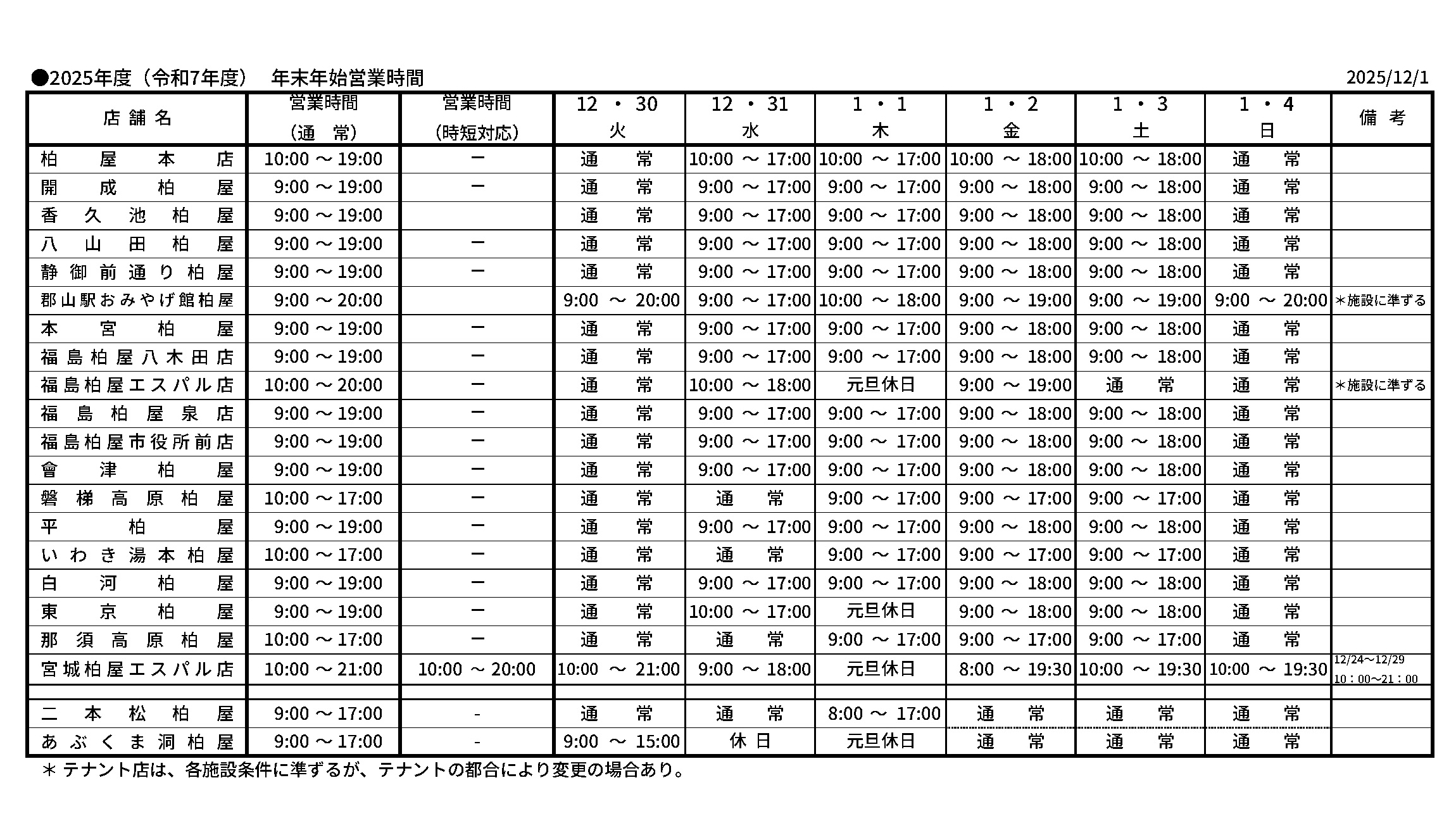 柏屋各店、年末年始の営業時間変更のお知らせ。 公開日: 2025/12/252025/12/25 誠に勝手ながら、柏屋各店におきまして年末年始の営業時間を変更させていただきます。 何卒ご容赦くださいませ。 ※柏屋のお店一覧はこちら 新着情報カテゴリーの記事
