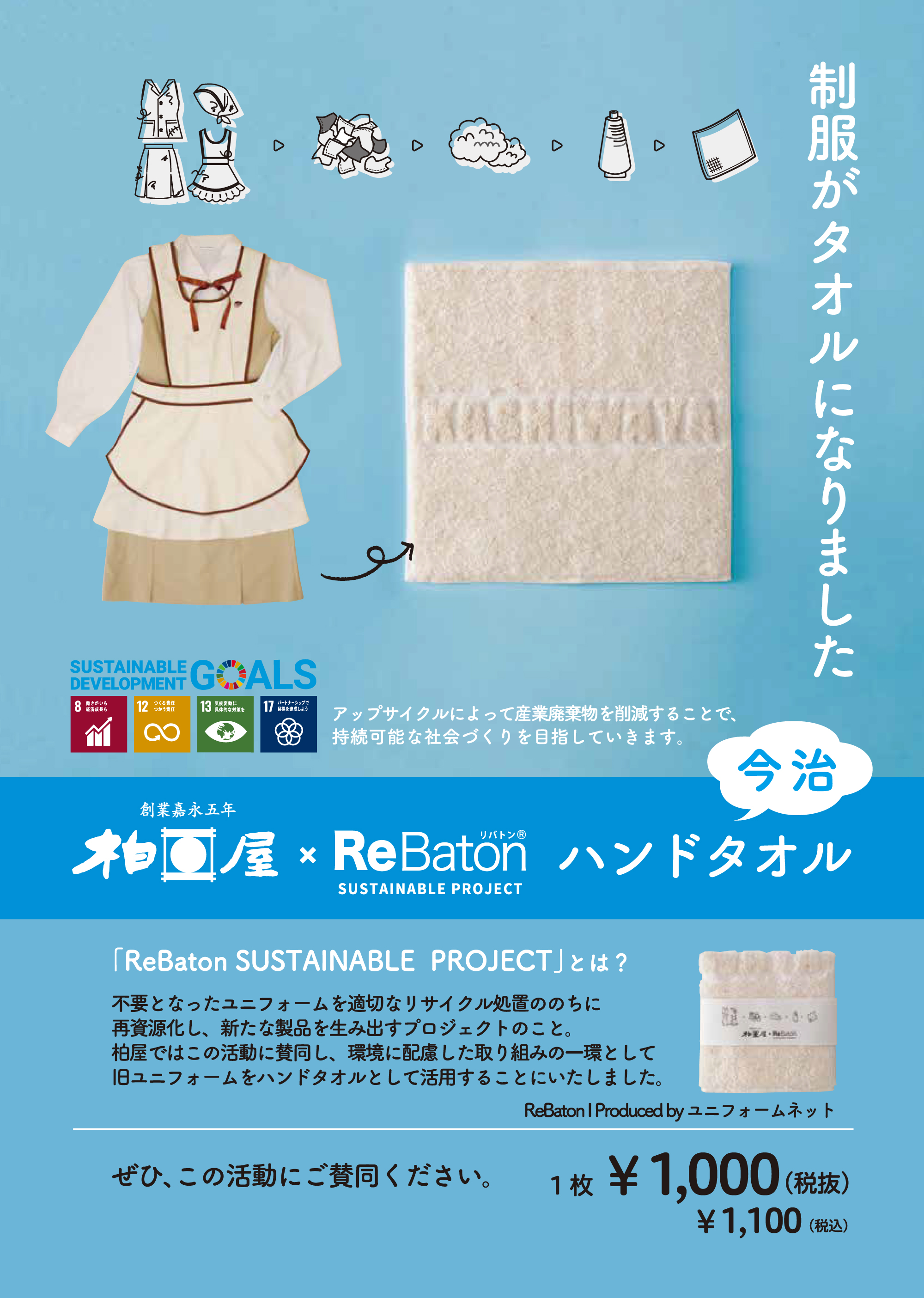 柏屋×ReBaton 今治ハンドタオルは柏屋各店、柏屋オンラインショップで販売中です。
